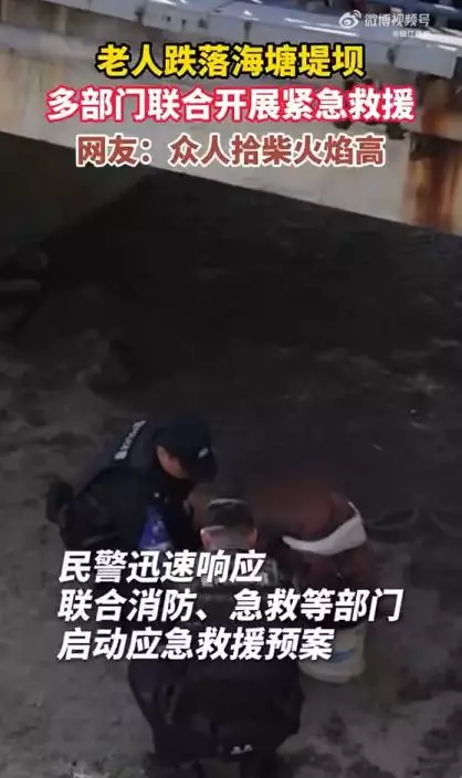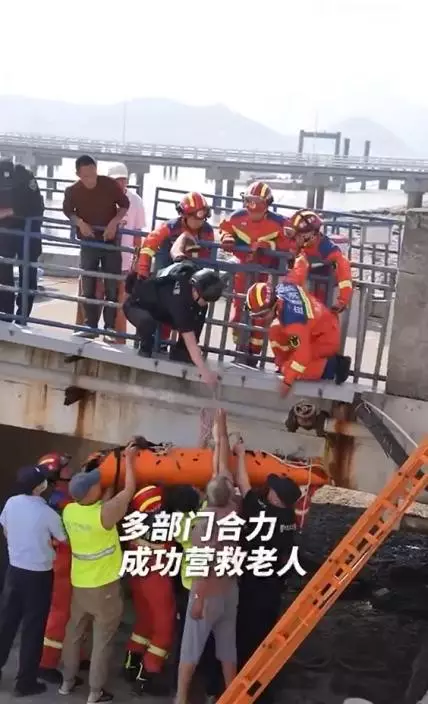 浙江一名6旬趕海老婦失足跌下4米高海塘堤壩,民警消防化身「人肉起重機」合力救出受困者。
