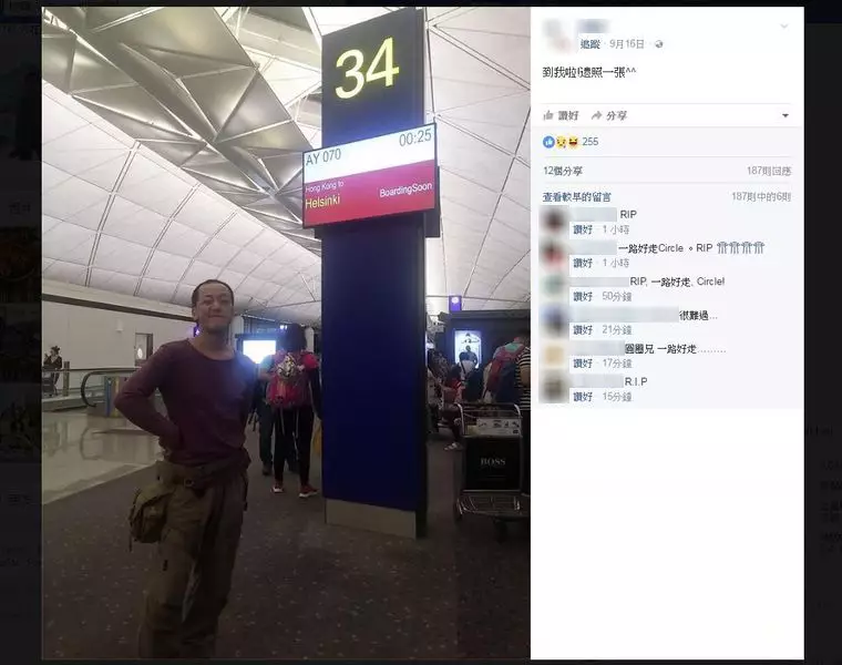 40餘歲姓蔡的死者,不時會在facebook上載攝影作品,並在多個攝影比賽中獲獎。他在上周四下午與9名友人由香港機場出發往冰島赫爾辛基自駕遊,原定25號回港,起飛前在候機室上載照片,留言「到我啦!遺照一張」,有朋友當時已回應叫他不要亂說,豈料一句戲言竟成真。事後友人都在蔡的facebook留言悼念。