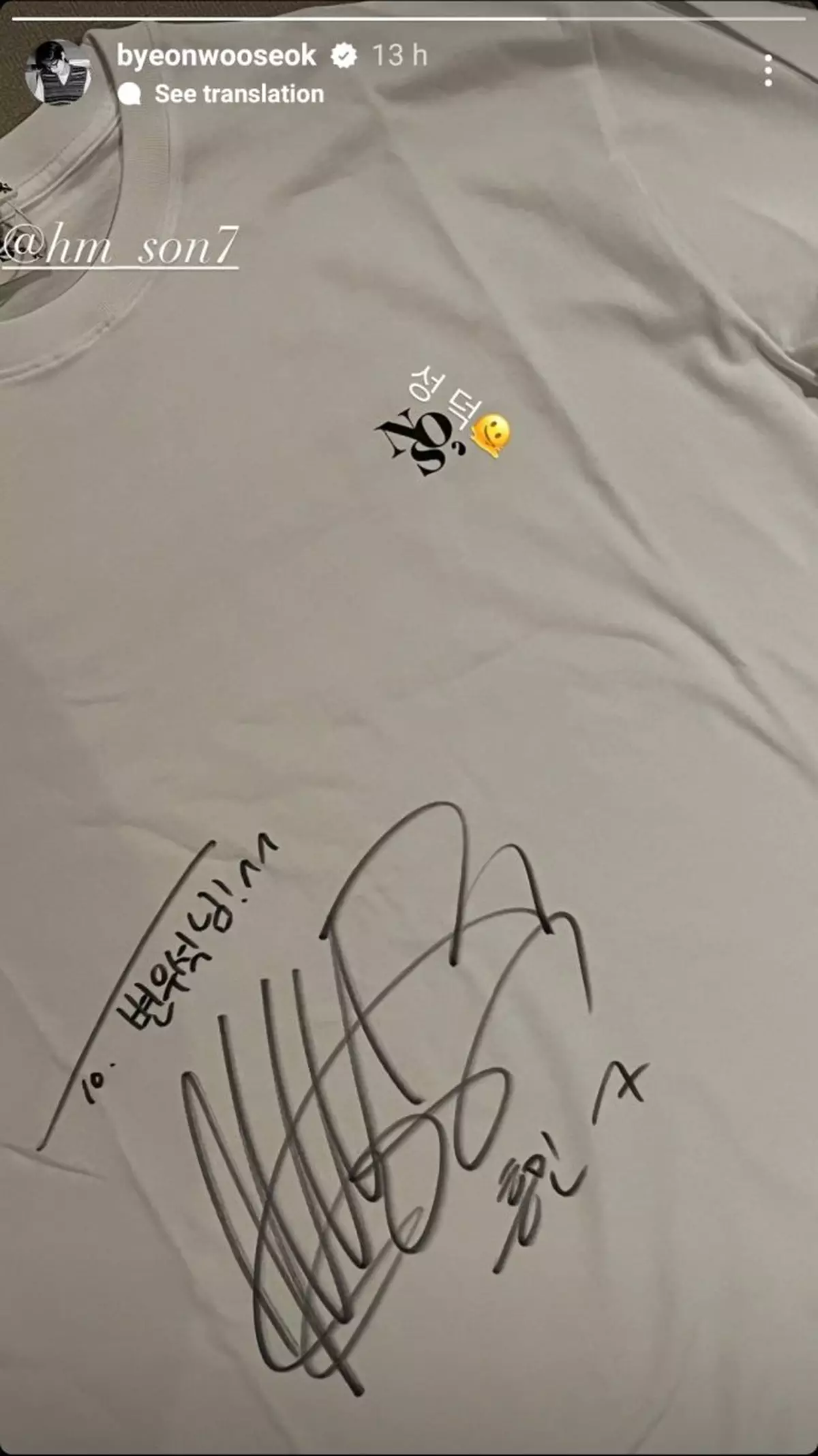 原來相中簽名的主人翁是韓國被稱為「亞洲一哥」的足球運動員孫興慜,而T恤正屬於孫興慜的時裝品牌NOS7,而品牌的社交平台亦有轉發邊佑錫的限時動態。邊佑錫在照片上寫下「成功的粉絲」配以一個融掉了的表情符號,足以感受到邊佑錫對收到這份禮物時的感動。