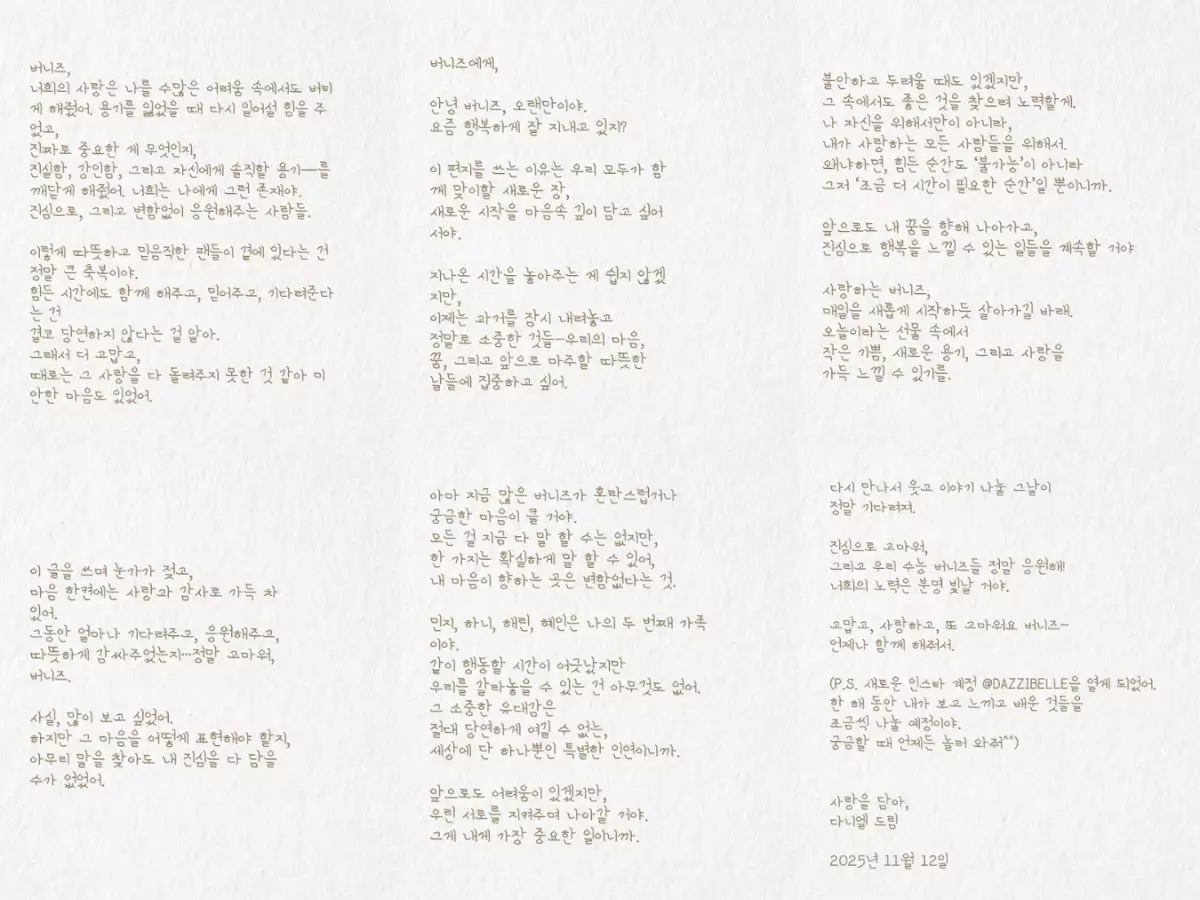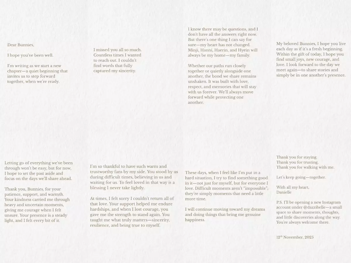 信中,Danielle對一路支持NewJeans的Bunnies表達最深的感激:「你們的愛讓我在無數困難中堅持下來,在我失去勇氣時給了我重新站起來的力量。」她承認自己目前讓許多粉絲感到混亂,但強調「我心之所向始終不變」,並無法立即說明一切細節。最令粉絲動容的部分,是她對4位隊友的深情告白:Minji、Hanni、Haerin與Hyein永遠是她的「第二個家族」、她的家人。她回憶五人從練習生時期到站上各大舞台的點滴,那些安靜相處與震耳欲聾的掌聲,都成為永不磨滅的回憶。「沒有任何事物能將我們分開,這份羈絆獨一無二、無法視為理所當然。即使未來仍面對困難,我們也會互相守護、繼續前進。」
