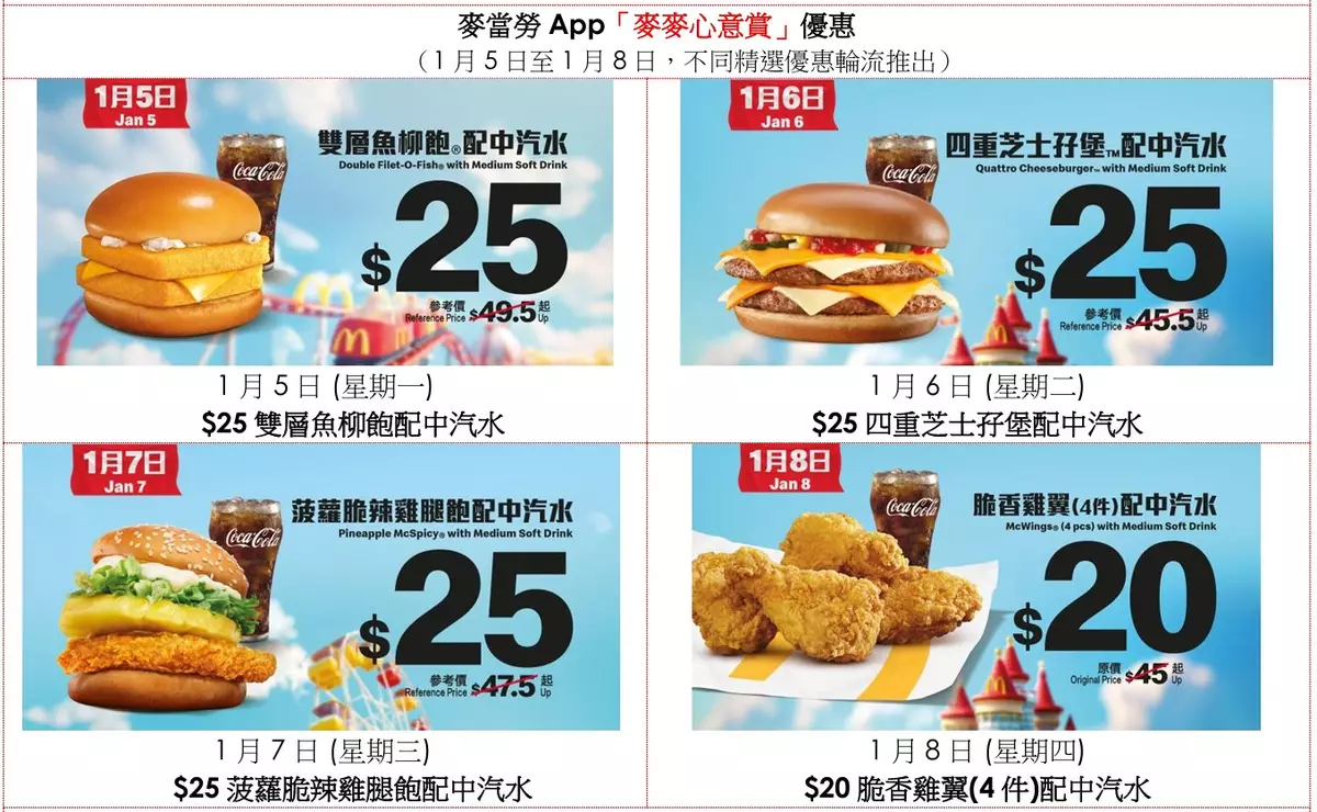 • 1月5日:$25雙層魚柳飽配中汽水(參考價:$49.5起)