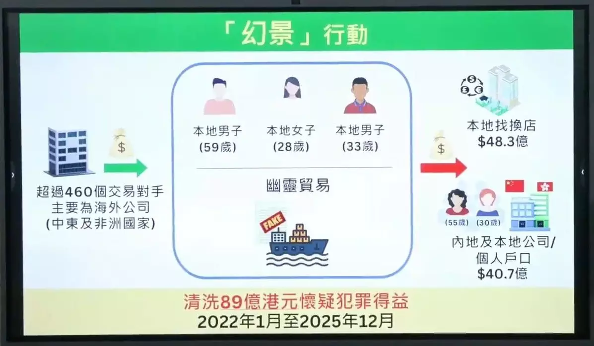 海關偵破一宗透過「幽靈貿易」清洗懷疑黑錢的案件,涉及89億元,拘捕5名男女,包括犯罪集團3名骨幹成員。