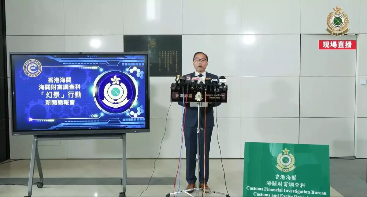 海關偵破一宗透過「幽靈貿易」清洗懷疑黑錢的案件,涉及89億元。圖為海關財富調查科高級調查主任蔡劍輝向傳媒交代案情。海關FB直播截圖
