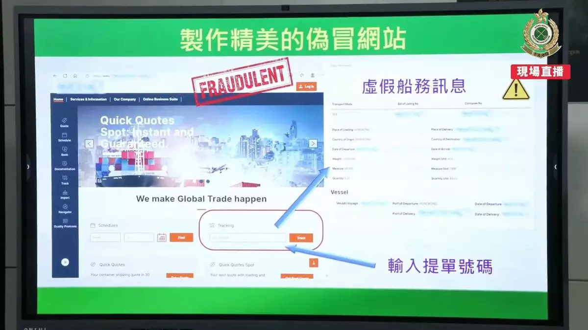 犯罪集團精心設立偽冒網站,配合其製作的虛假貿易文件,以掩飾幽靈貿易及背後的洗黑錢行為。海關FB直播截圖