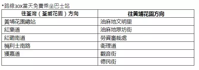九巴表示,當日九巴路線8當天將全線向乘客提供免費服務,途徑紅磡、黃埔、何文田、油麻地和佐敦,接載市民往返各區;路線30X則在路線上介乎油麻地至黃埔的指定巴士站可以免費乘搭,接載乘客來往黃埔、何文田、油麻地至旺角、太子、深水埗、荔枝角和荃灣一帶。