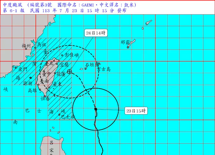 颱風格美逐漸靠近台灣,當地氣象部門先後發出海上和陸上颱風警報,預計格美24日晚深夜至25日清晨之間在宜蘭登陸。