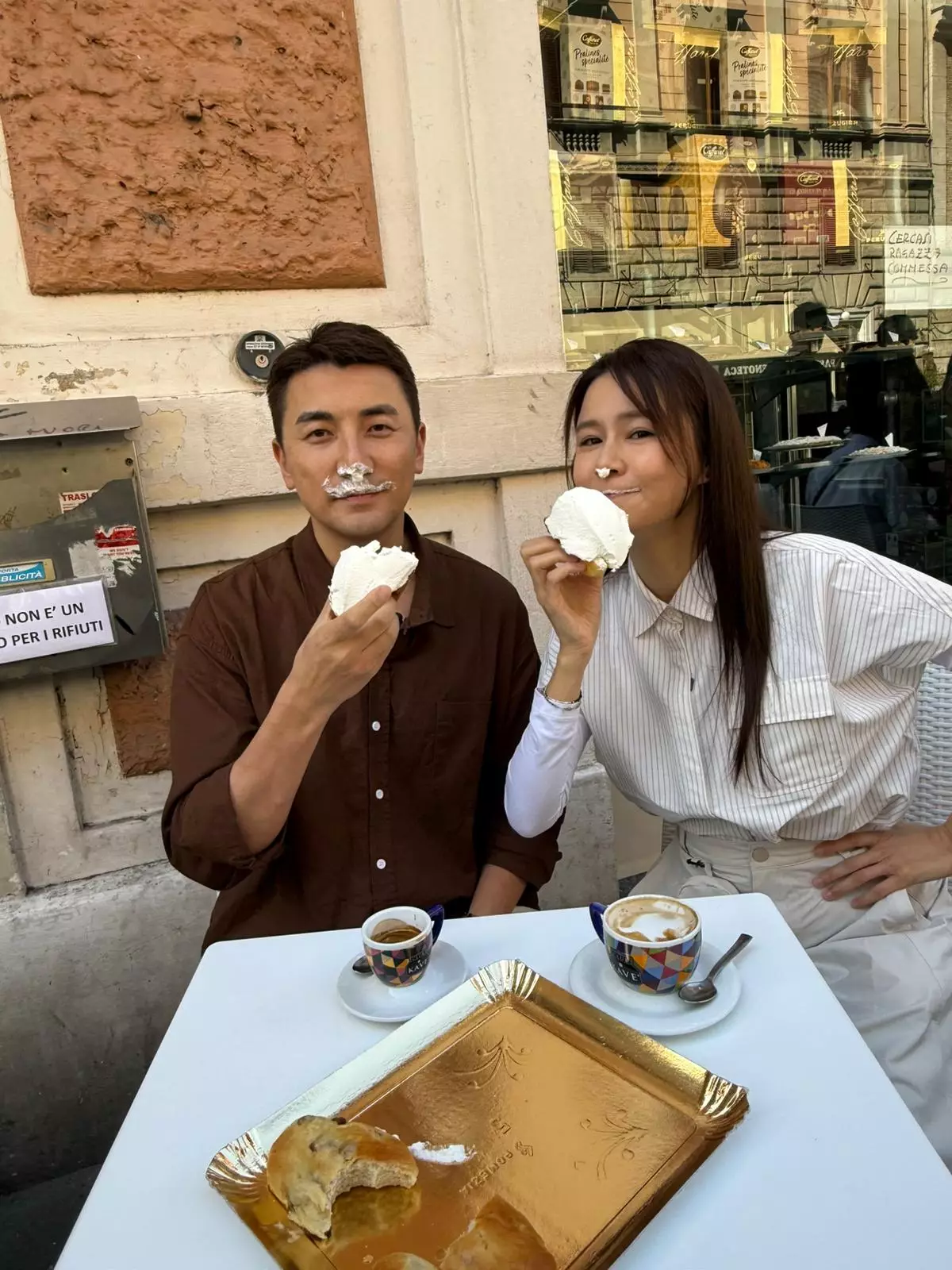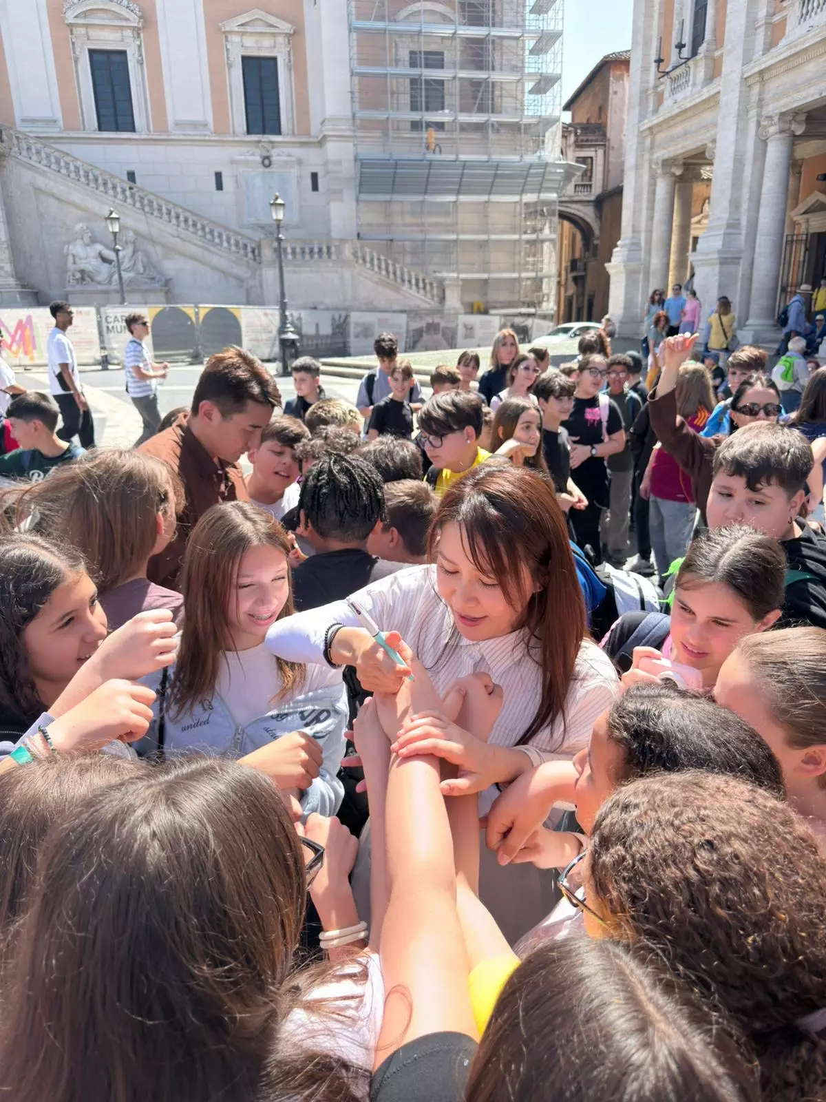 二人雖遠赴意大利,依然深受當地人歡迎,被數十名小學生重重包圍索取簽名。