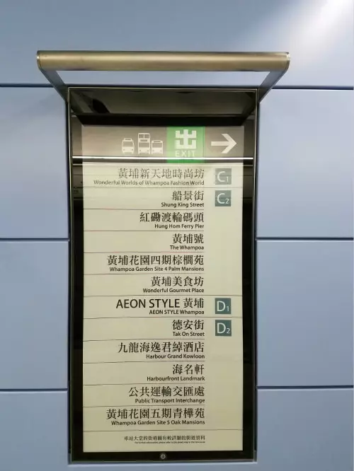 黃埔站採用單側式月台設計,一落車就要選定大堂,前往A出口如家維邨、黃埔新邨;或前往B出口如海濱南岸如理大學生宿舍的乘客,謹記要轉左上西面大堂,前往C出口如紅磡渡輪碼頭、黃埔美食坊的乘客;或前往D出口海名軒的乘客,謹記落車要轉右上東面大堂。