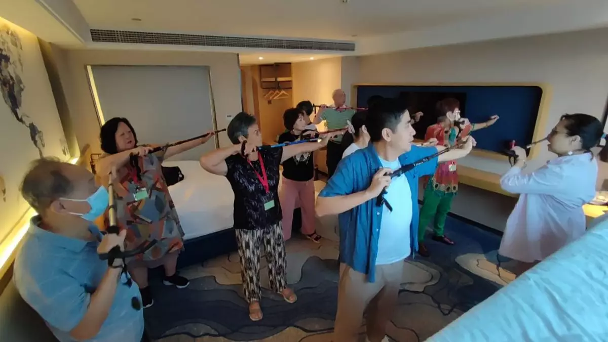 中醫師將手杖操帶進這次的養生旅行團,預備一些登山杖給長者們學習手杖操。長者們吃過早餐後,在社工的安排下,在房間內分組學習「八式手杖晨操」。