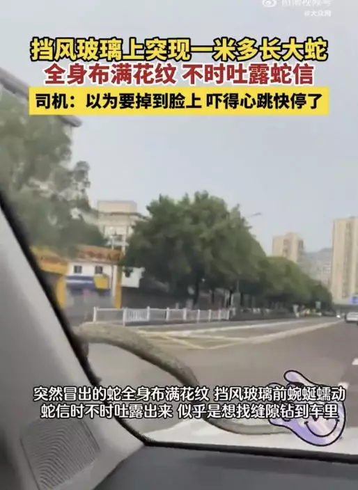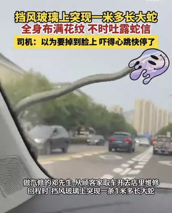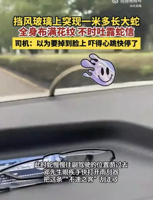 鄧男慌忙將車停靠到路旁,蛇便在擋風玻璃外往副駕駛座的方向爬過去,鄧男見狀快速開啟雨刷器,試圖將蛇刮離驅逐。
