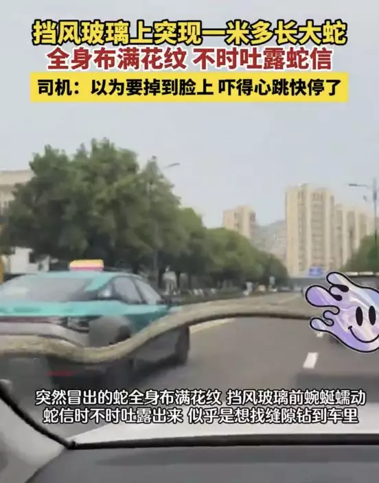 浙江一名男維修工開車驚見擋風玻璃竟有1米長蛇隻嚇壞,緊急停靠路邊開啟雨刷器驅逐。