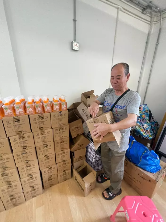居民佘先生協助村內派發洗水液,常擔當義工協助其他居民。