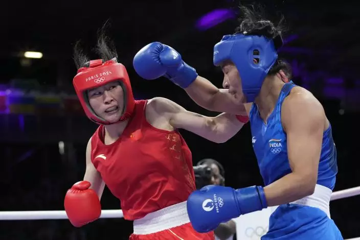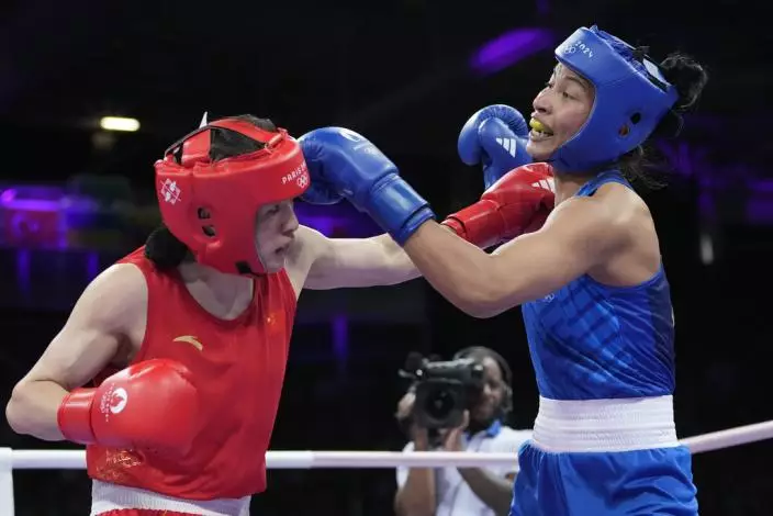 巴黎奧運拳擊女子75公斤級8強戰,國家隊李倩(左)淘汰印度選手博爾戈海因。AP圖片