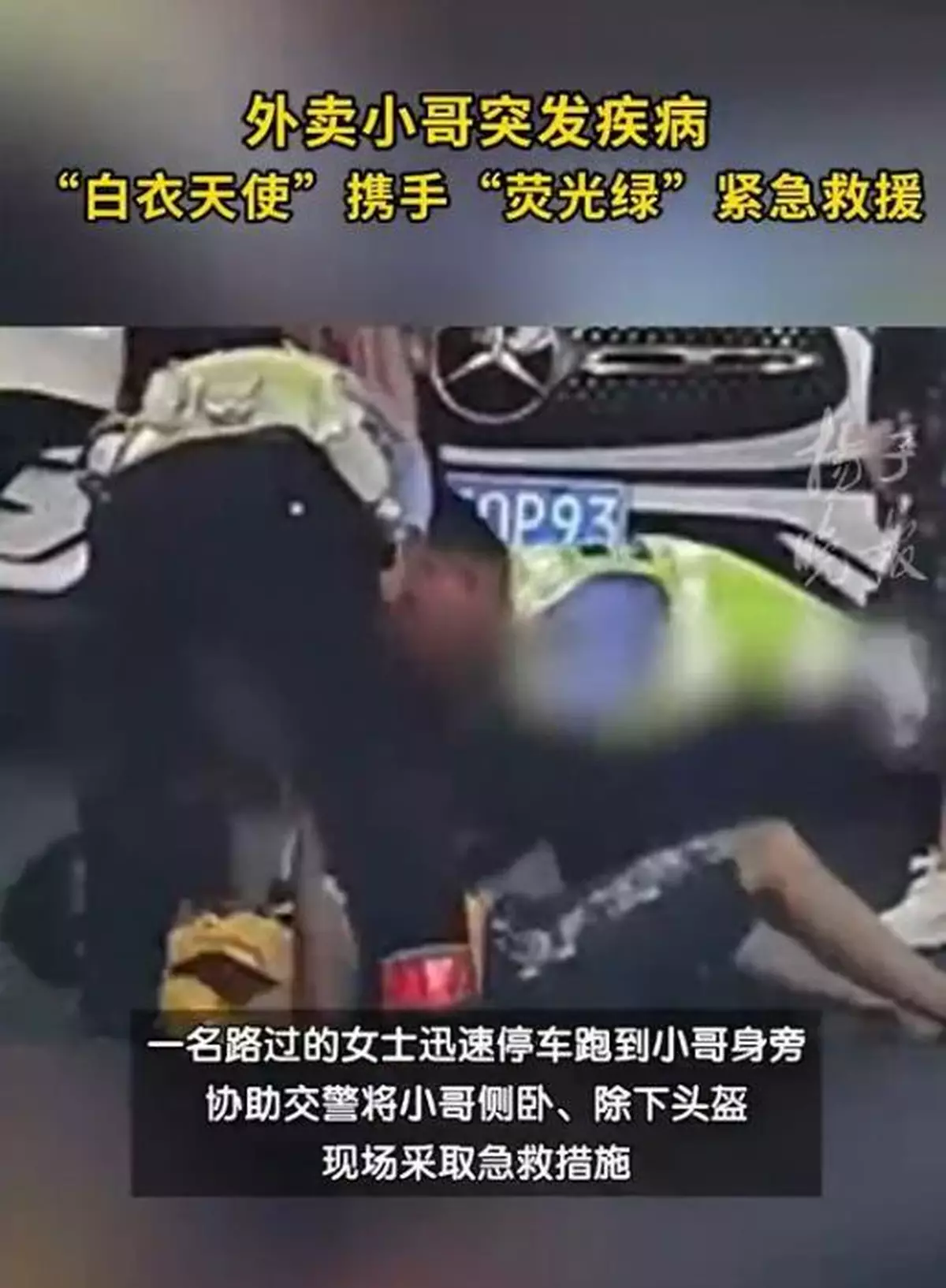 江蘇外賣員送餐突連人帶車摔倒地上,抽搐口吐白沫症狀,幸獲路過交警護士攜手相救脫險。之後交警更貼心幫他送餐。