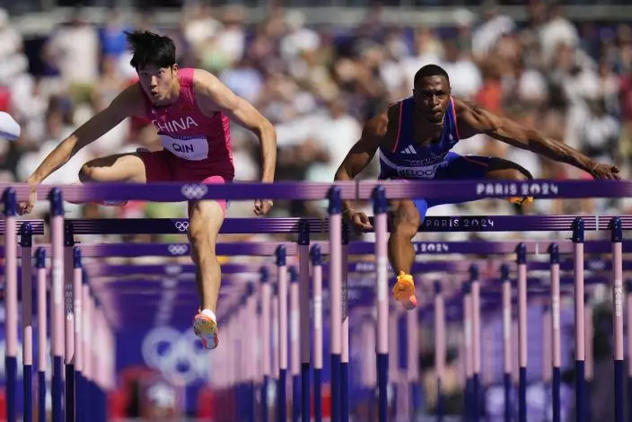 田徑項目男子110米跨欄復活賽,國家隊代表秦偉搏(左)在復活賽第3組得首名,晉級準決賽。AP圖片