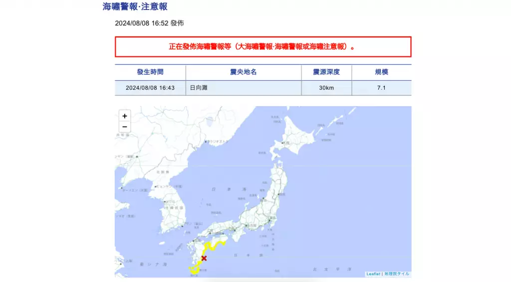 日本九州宮崎縣東面太平洋於香港時間下午3時許,發生7.1級強烈地震,當局發出海嘯警告。