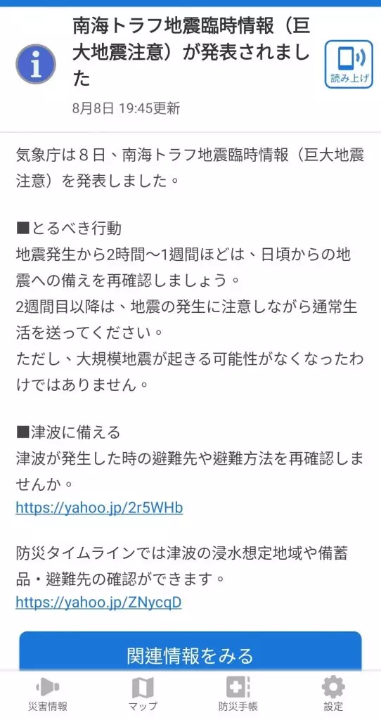 氣象廳同日發布「南海海槽地震臨時資訊」,是2019年啟動以來首次。經研判後,專家認為是次地震與南海海槽地震有關,故發布「巨大地震注意」警報。預測南海海槽30年內發生大地震機會率達到70%至80%,將席捲整個西日本,太平洋沿岸可能會出現高達34米高海嘯,損失估計會是2011年311東日本大地震的10倍。