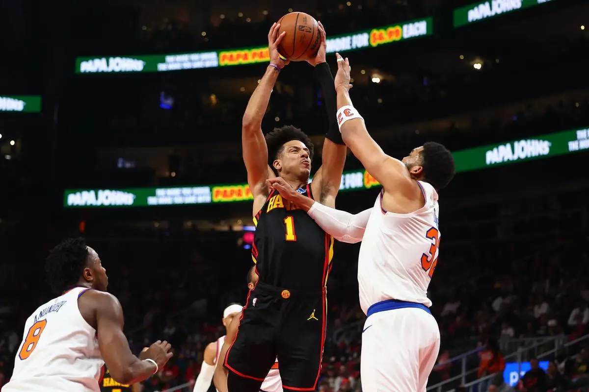 2026年4月6日周一,亞特蘭大一場NBA籃球賽上半場,鷹隊前鋒贊倫莊臣(左)嘗試射球,紐約人中鋒卡爾安東尼唐斯(右)防守。(美聯社圖片/Colin Hubbard) AP圖片
