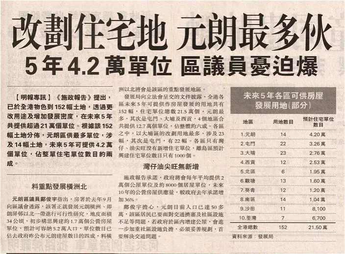 文章又引述鄺俊宇話,元朗人口已經有50萬, 若政府在區內增建公屋,會進一步加重區內社區設施的負擔。