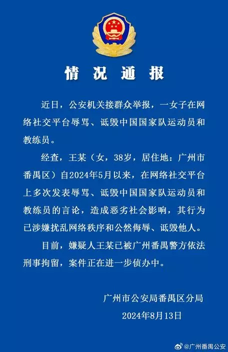 廣州市番禺公安公布,一名女子多次辱駡、詆毀中國國家隊運動員和教練員被刑事拘留。