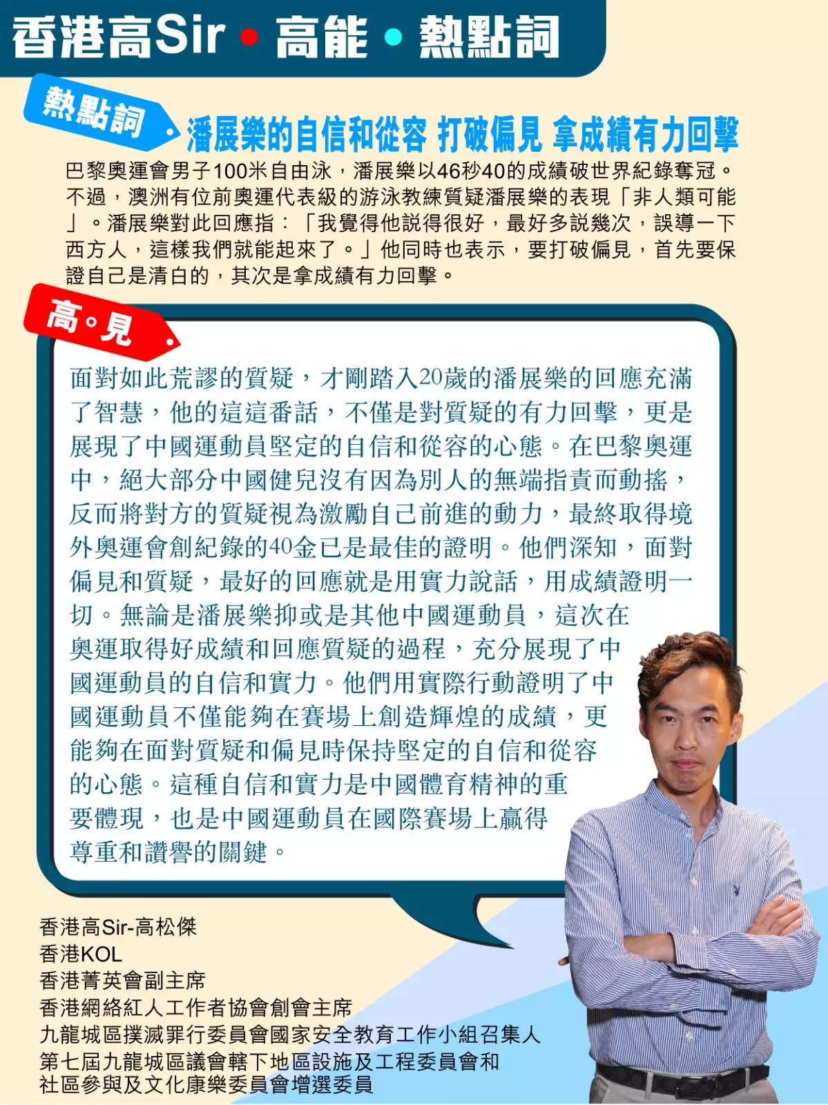 高Sir:面對如此荒謬的質疑,才剛踏入20歲的潘展樂的回應充滿了智慧,他的這這番話,不僅是對質疑的有力回擊,更是展現了中國運動員堅定的自信和從容的心態。在巴黎奧運中,絕大部分中國健兒沒有因為別人的無端指責而動搖,反而將對方的質疑視為激勵自己前進的動力,最終取得境外奧運會創紀錄的40金已是最佳的證明。他們深知,面對偏見和質疑,最好的回應就是用實力說話,用成績證明一切。無論是潘展樂抑或是其他中國運動員,這次在奧運取得好成績和回應質疑的過程,充分展現了中國運動員的自信和實力。他們用實際行動證明了中國運動員不僅能夠在賽場上創造輝煌的成績,更能夠在面對質疑和偏見時保持堅定的自信和從容的心態。這種自信和實力是中國體育精神的重要體現,也是中國運動員在國際賽場上贏得尊重和讚譽的關鍵。