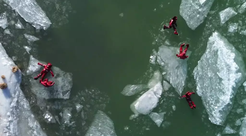 在寧夏銀川的月海湖,遊客可體驗「冰上漂浮」的獨特活動。參與者身穿特製紅色防護服,其內層鎖熱、外層高浮力,確保在冰水中保持溫暖與安全。現場還提供無人機與相機拍攝服務,記錄放鬆時刻。有遊客表示:「週末願意來附近城市體驗這種無需費力的放鬆,我覺得相當解壓。」