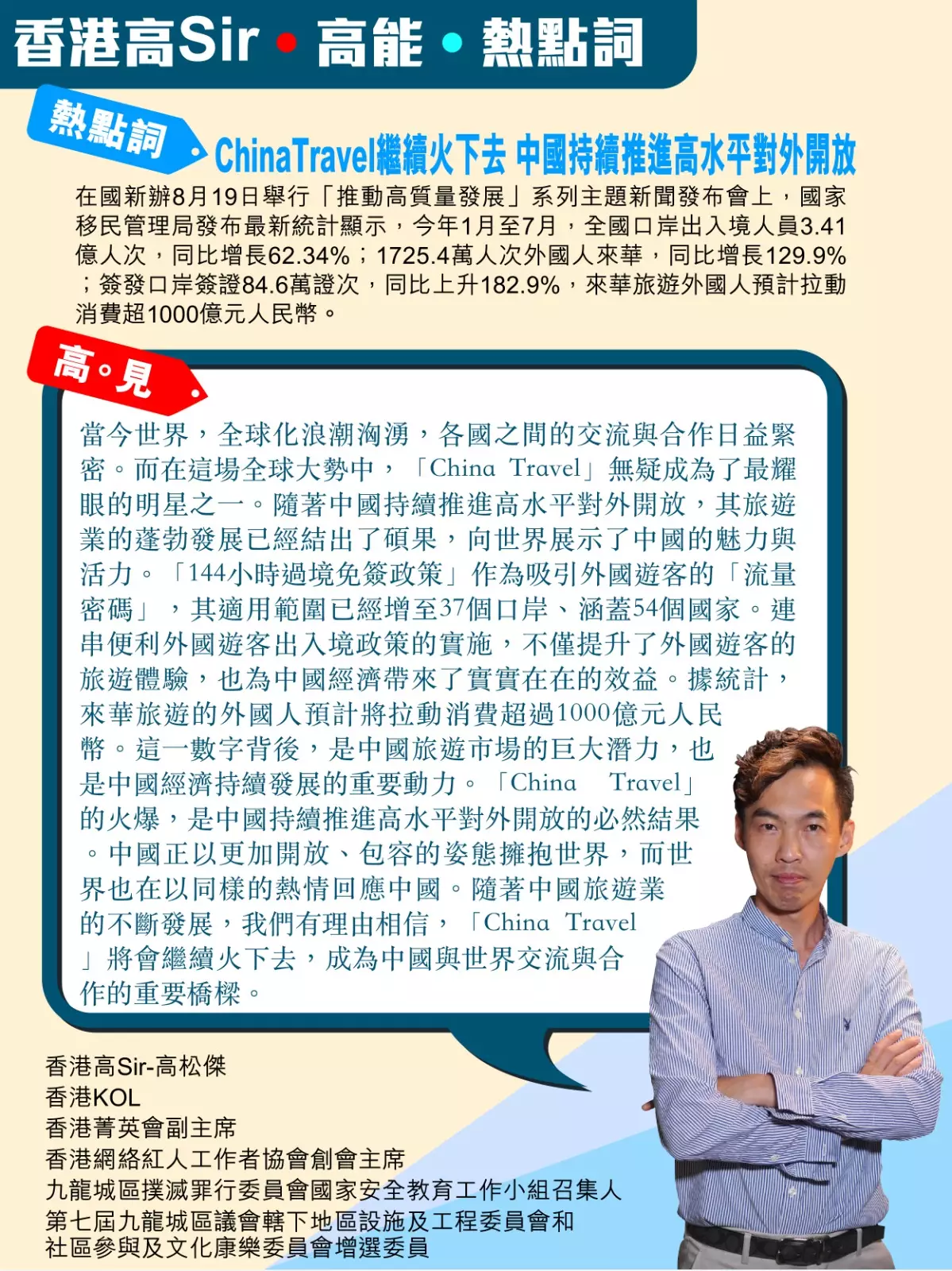 高Sir:當今世界,全球化浪潮洶湧,各國之間的交流與合作日益緊密。而在這場全球大勢中,「China Travel」無疑成為了最耀眼的明星之一。隨著中國持續推進高水平對外開放,其旅遊業的蓬勃發展已經結出了碩果,向世界展示了中國的魅力與活力。「144小時過境免簽政策」作為吸引外國遊客的「流量密碼」,其適用範圍已經增至37個口岸、涵蓋54個國家。連串便利外國遊客出入境政策的實施,不僅提升了外國遊客的旅遊體驗,也為中國經濟帶來了實實在在的效益。據統計,來華旅遊的外國人預計將拉動消費超過1000億元人民幣。這一數字背後,是中國旅遊市場的巨大潛力,也是中國經濟持續發展的重要動力。「China Travel」的火爆,是中國持續推進高水平對外開放的必然結果。中國正以更加開放、包容的姿態擁抱世界,而世界也在以同樣的熱情回應中國。隨著中國旅遊業的不斷發展,我們有理由相信,「China Travel」將會繼續火下去,成為中國與世界交流與合作的重要橋樑。