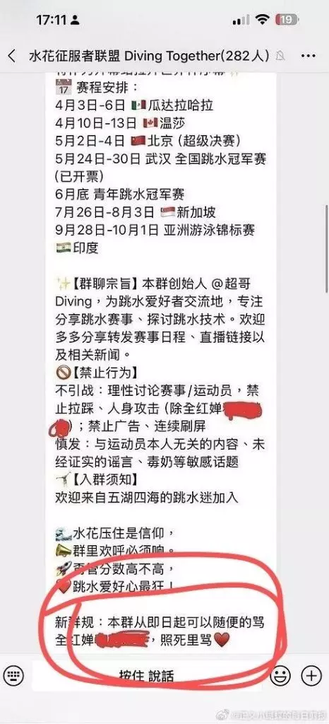 群內長期存在針對全紅嬋的侮辱性外號與人身攻擊言論。此前,全紅嬋在接受媒體採訪時含淚懇求「不要再罵我了」的畫面,已引起廣泛關注。