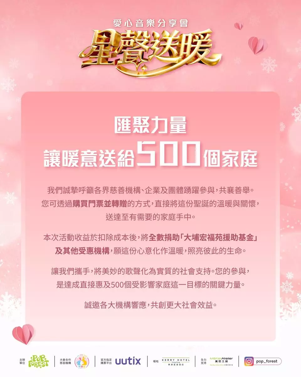 四位參與歌手表示,「好希望透過呢次機會,用自己擅長嘅音樂為社區出力、回饋社會。一份門票,唔單止可以聽到好歌,更係將祝福同援助直接送到有需要嘅人手中。」這個冬天,讓我們用愛心跟音樂,為受創的社區打氣,將溫暖及祝福,化作最實際的支持。