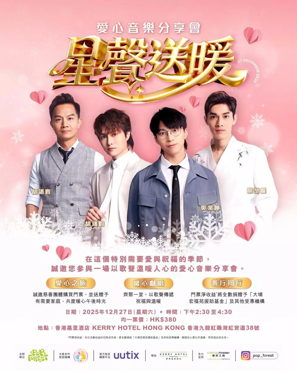 吳業坤、胡鴻鈞、關楚耀及胡諾言四位歌手,將於12月27日聯手舉辦一場特別的「星聲送暖 • 愛心音樂分享會」。這場音樂會並非普通表演,而是一個充滿愛心的行動。四位歌手希望以最真摯的歌聲,為受火災影響的街坊及社區,搭建一座音樂橋樑,凝聚善意,一起為這個冬日注入一股實在的暖流。