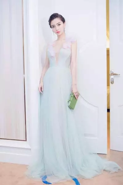 Angelababy今晚出席內地大眾電影百花獎頒獎禮,身穿淡藍色deep v透視禮服亮相,優雅不失性感。長裙上半身設計大膽,不過下半身就密密實實,不知Angelababy是否精心挑選這套禮服,遮掩孕肚。