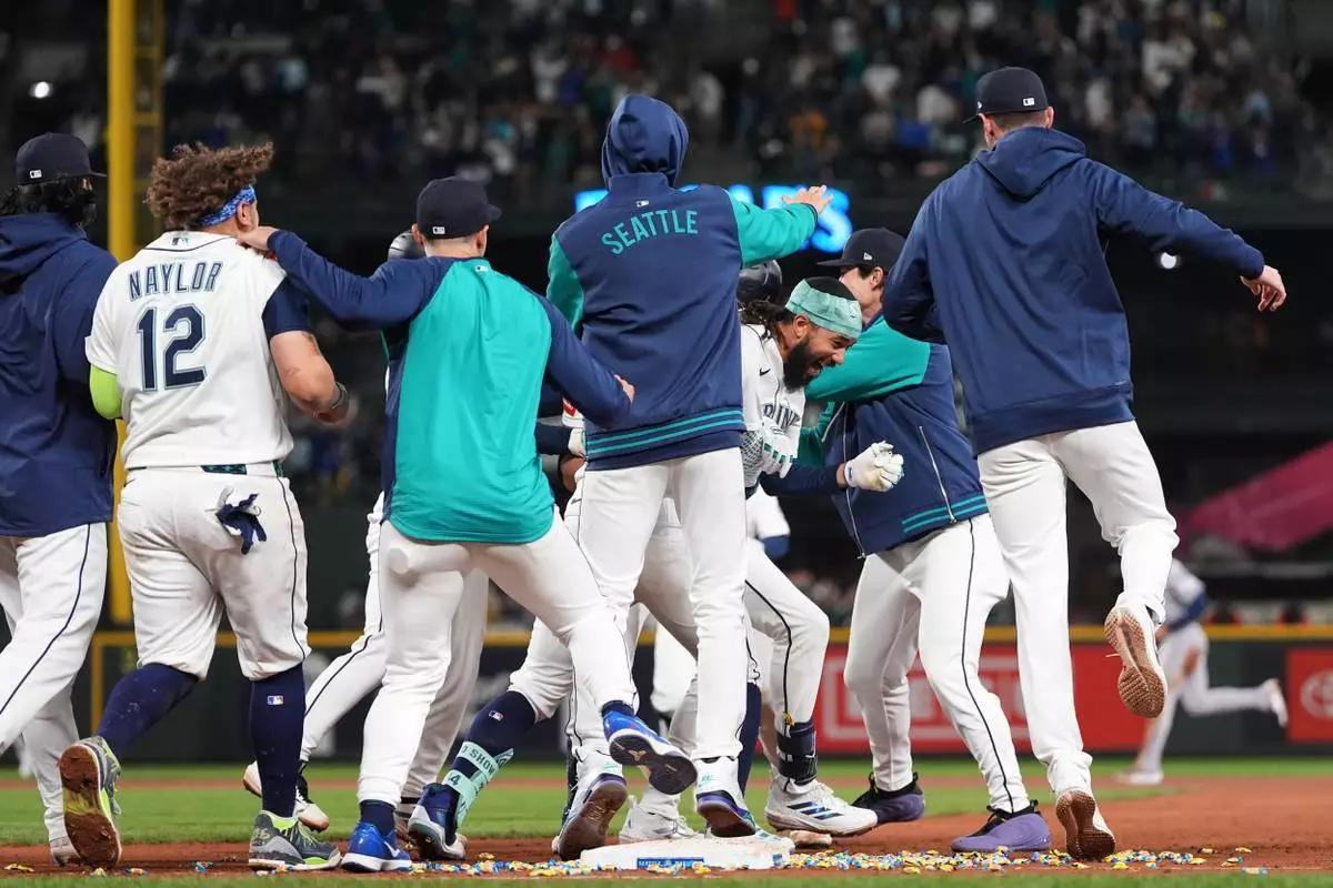 2026年4月11日周六,西雅圖水手隊的克勞福德(J.P. Crawford)(中,面向鏡頭)在西雅圖一場棒球賽的第九局,對陣休斯頓太空人隊時擊出致勝的再見安打後,與隊友一同慶祝。(美聯社圖片/Lindsey Wasson) AP圖片
