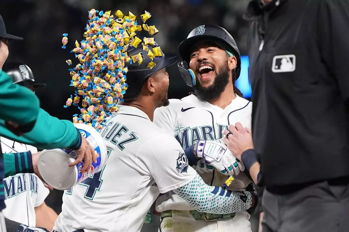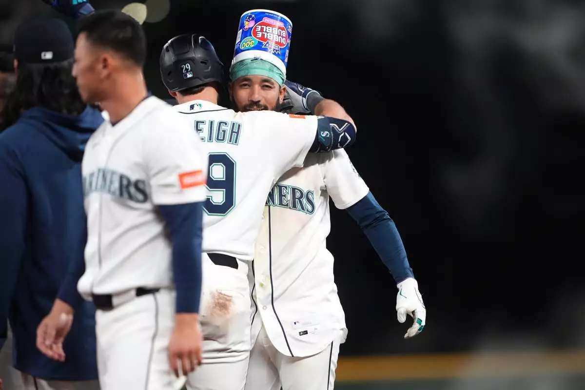 2026年4月11日周六,西雅圖水手隊的克勞福德(J.P. Crawford)(面向鏡頭)在西雅圖一場棒球賽的第九局,對陣休斯頓太空人隊時擊出致勝的再見安打後,與賴利(Cal Raleigh)(29號)一同慶祝。(美聯社圖片/Lindsey Wasson) AP圖片