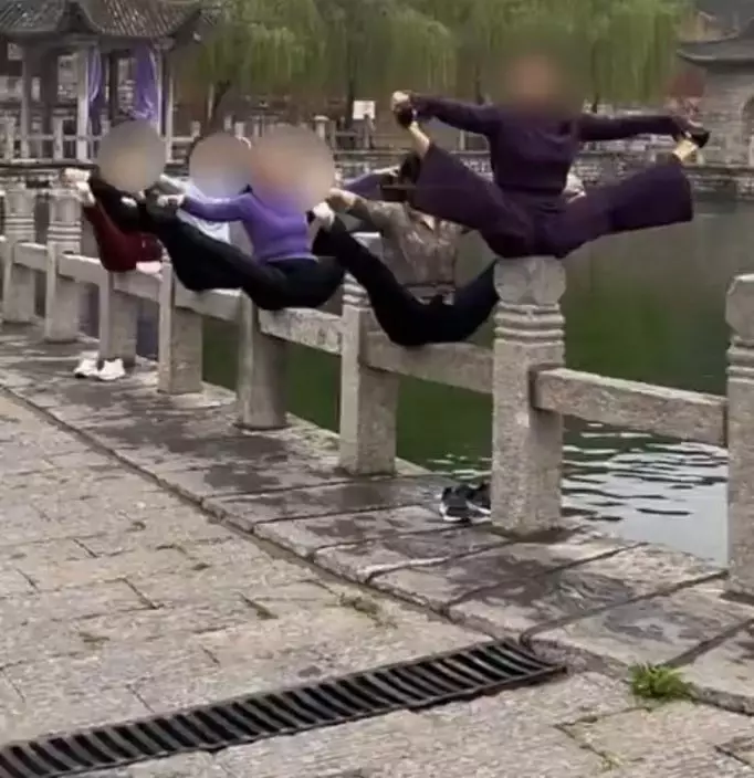河南景區多名女子在湖邊石質欄桿上做倒立劈腿等高難度瑜伽動作惹議,景區事後稱將加強巡查制止不當行為。