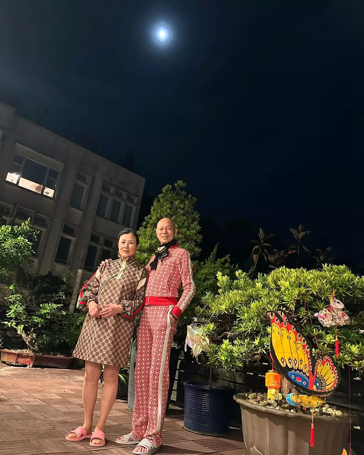 阿姐留言送祝福:「祝願大家中秋節快樂!人月兩團圓!」相片可見,阿姐身穿GUCCI 2021年款的Monogram高領迷你連身裙,而家英哥穿上2022年Wales Bonner春夏款的紅色運動套裝,兩人情侶裝上陣,在明月下合照,更一齊玩蝴蝶燈籠,畫面恩愛又溫馨。