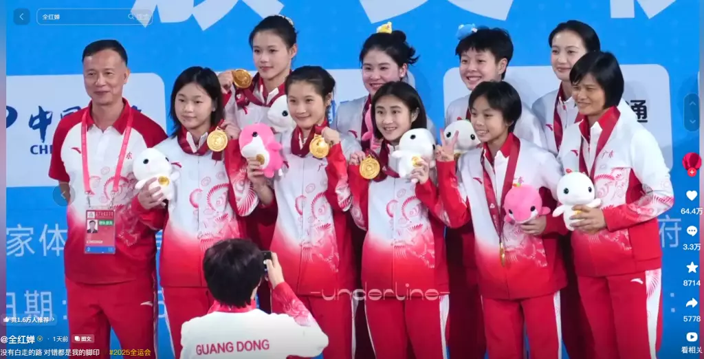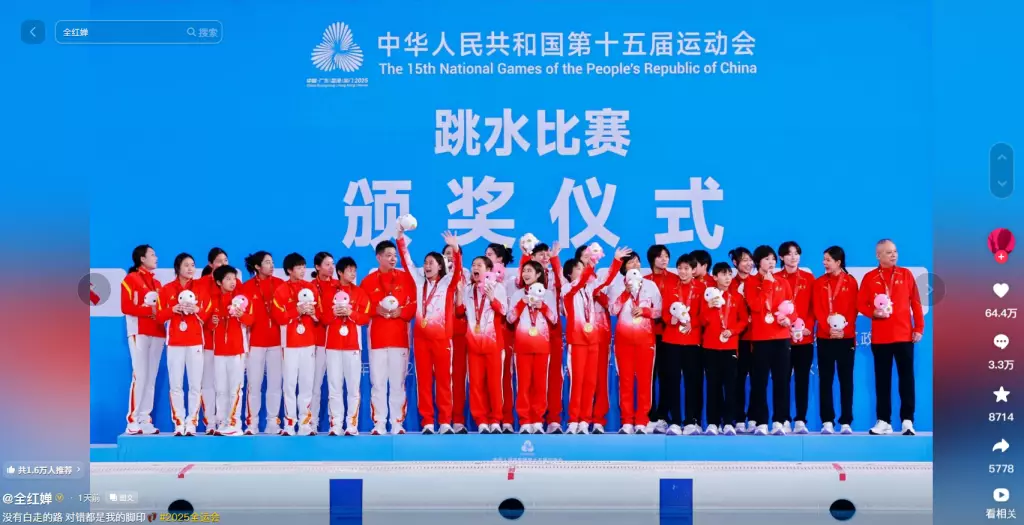 12日淩晨,全紅嬋在社媒上曬出多張全運會現場圖,其中包括她和隊友合影,頒獎儀式,以及大量全運會個人花絮內容。全紅嬋配文寫道:「沒有白走的路,對錯都是我的腳印。」