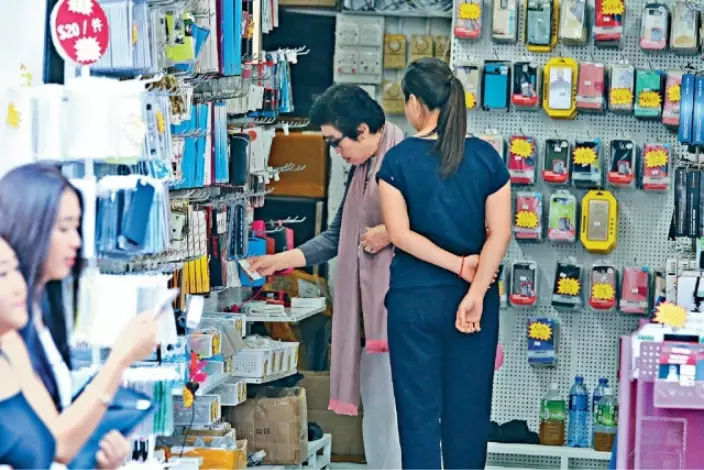 她在「雜架攤」內專揀手機配件,手機座、手機托等,連夾在手機上影相的廣角鏡頭仔都買,黎Auntie都幾潮。「大客仔」乜都買,女店員貼身服侍,黎媽媽仲同店員有講有笑,同愛女黎姿一樣,全無架子。