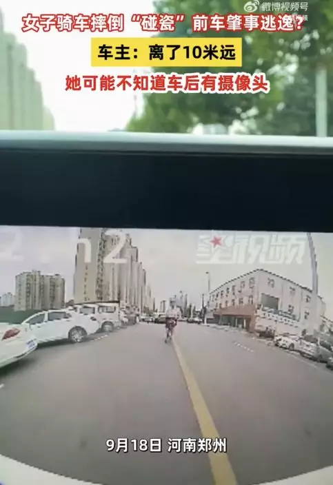 據《星視頻》報道,河南鄭州一名女子日前踩單車行經一路段時,因不明原因突然摔倒在地。事後,該名女子指控距離10米外的汽車司機肇事逃逸。