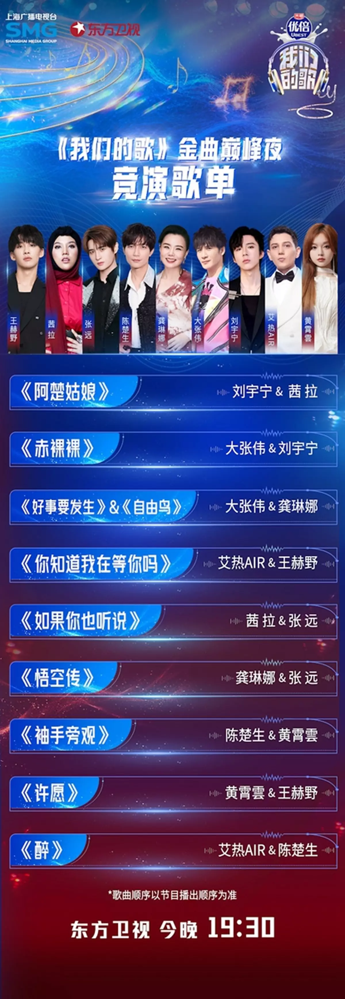 最後他向東方衞視以及《我們的歌》劇組致歉,為大家帶來各種不便,感謝大家的諒解::「在此,我要向東方衞視以及《我們的歌》劇組致歉,為大家帶來了各種不便,並感謝大家的諒解。同時我也要向與我合作的兩位年青歌手黃霄雲、王赫野致歉,沒辦法與兩位帶來準備好的舞台。待我痊癒後,我們一定要約好再續合作的緣份。」最後,他向期待《我們的歌》的樂迷們致歉,期待能盡快康復,再次為大家帶來音樂和舞台。