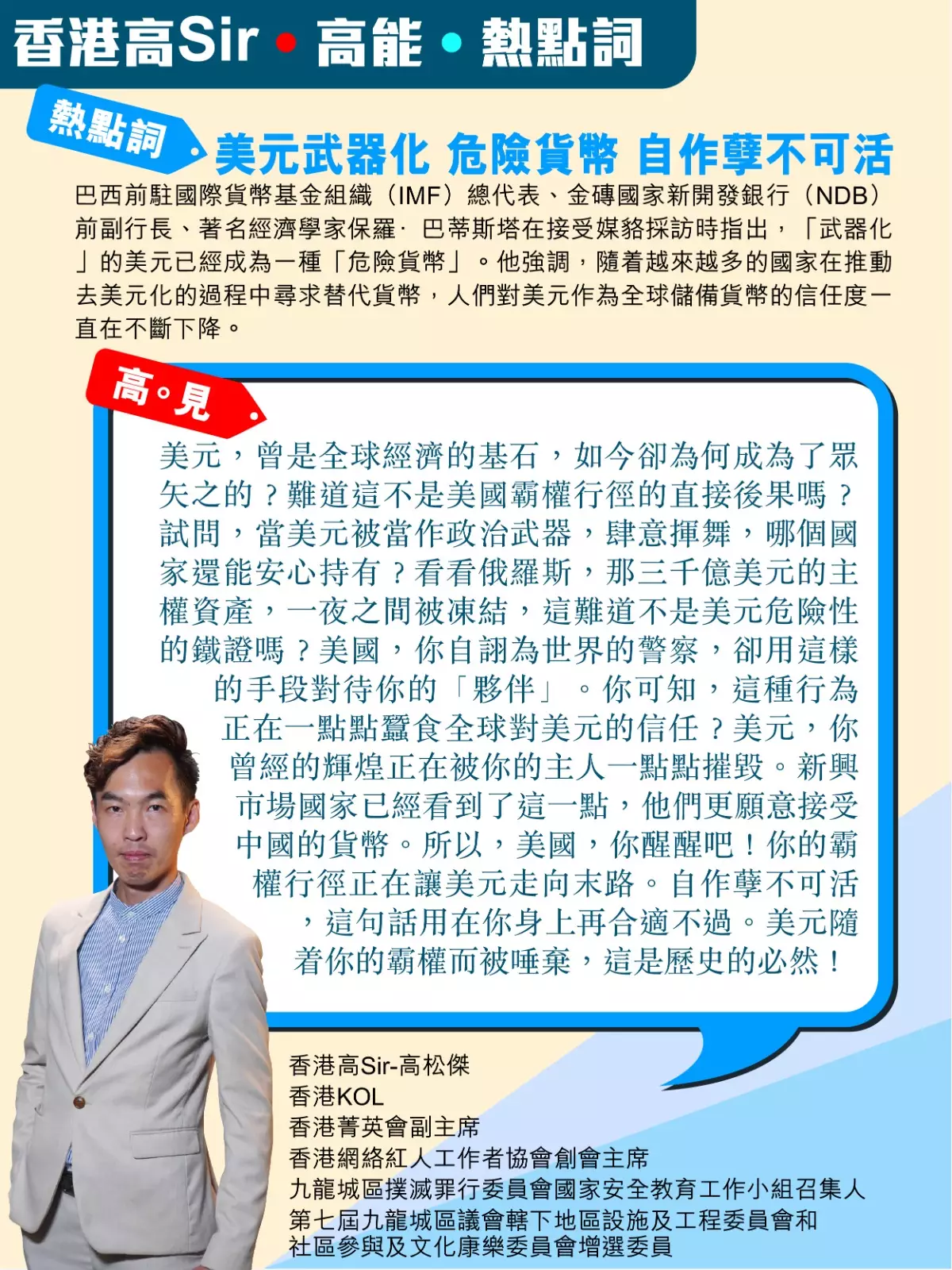 作者簡介:高松傑,人稱高Sir,男,香港建設力量KOL、時評人,大灣區創業者、灣區推介官、2023深圳十大好網民,工商管理碩士,本科修商業、公共及社會行政,多個平台均有文章及視頻專欄,發放愛國愛港正能量,講好中國故事及香港故事
