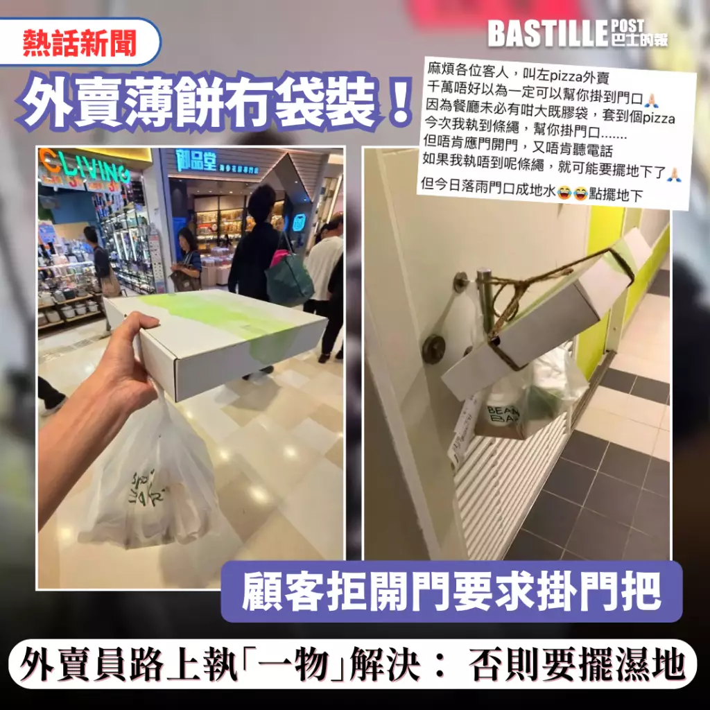 近日有外賣員接到薄餅外賣訂單,顧客要求將食物掛在門把上,但餐廳未提供足夠大的膠袋。外賣員急中生智,在路邊撿到一條繩子,成功將薄餅盒綁在顧客鐵閘門把上,事件引發熱議。