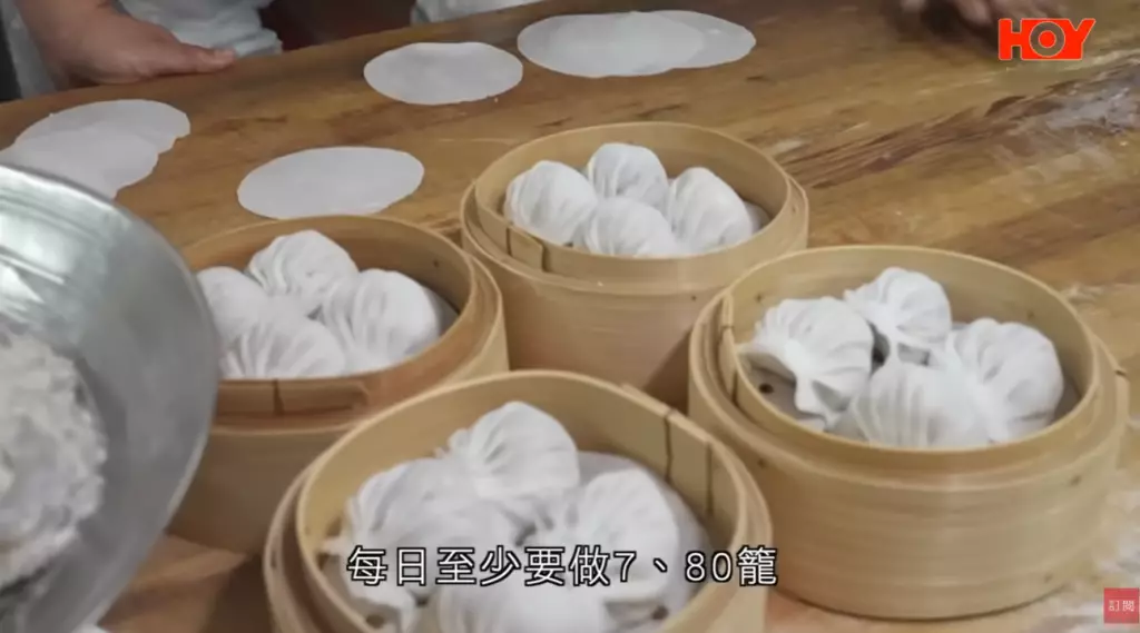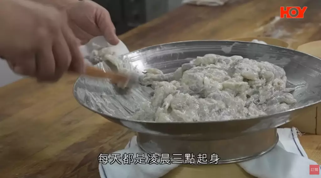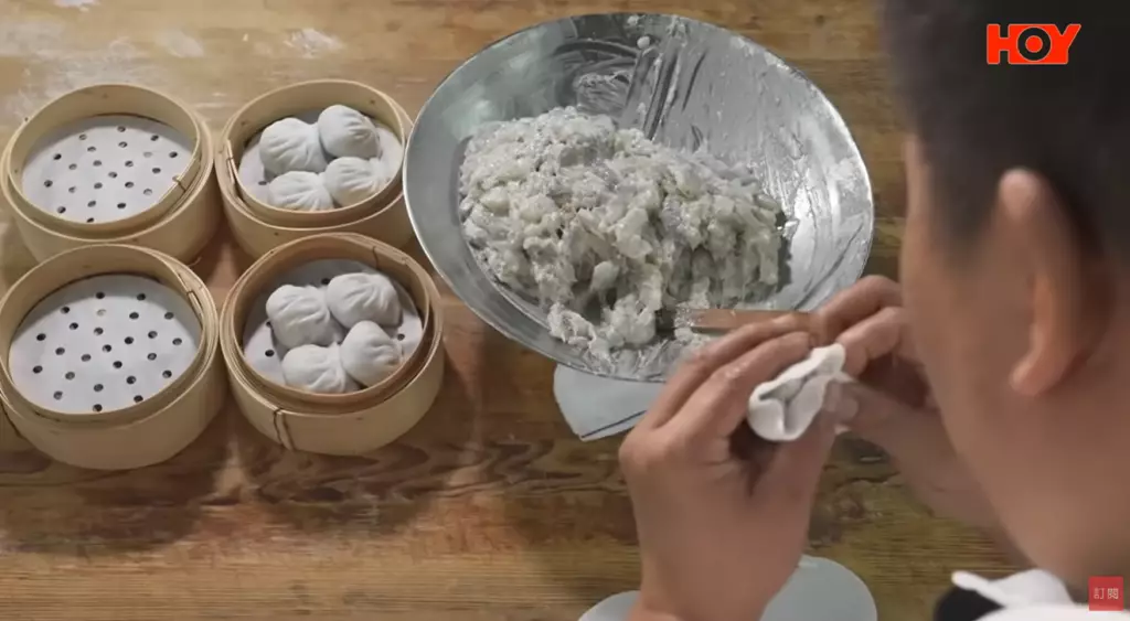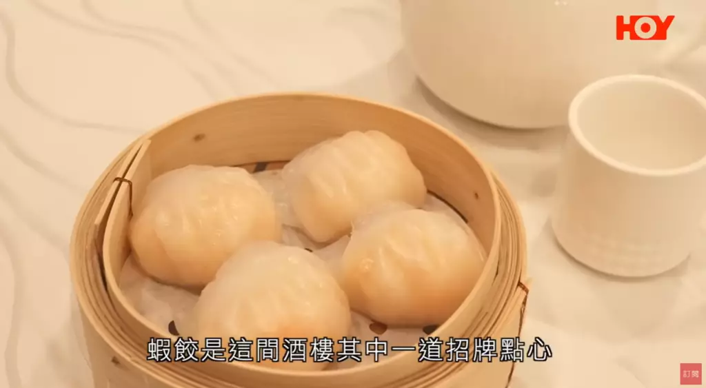 蝦餃是酒樓的其中一道招牌點心,點心師傅輝哥入行30多年,每天都要凌晨三時起床,單是蝦餃,他和伙記每日至少要做七八十籠。搓麵,刀背起皮,包蝦餃,人手搓的蝦餃皮更滑身一些,輝哥:「用機器製作要放很多粉才行,沒有那麼彈牙」,而且預製蝦餃一定要雪藏運輸,賣相和肉質都跟新鮮製作的不太一樣,「沒有光澤了,肉質沒那麼好,餡不夠多汁。」