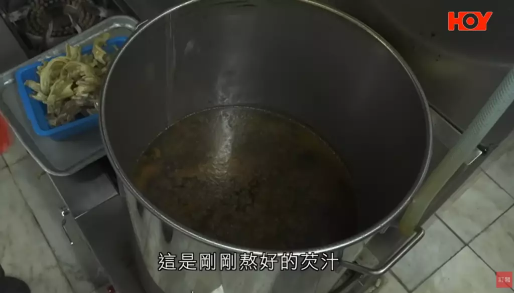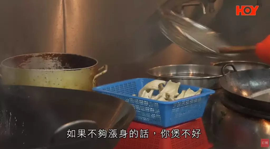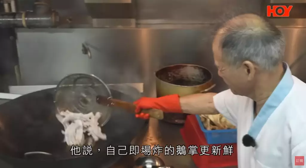 燒油,油熱,冒出白煙,放入鵝掌,炸一會再盛出鵝掌。「現在是炸到這樣,你要炸到它夠脹身,才能煲得入味,如果不夠脹身的話,你煲不好。」主廚輝哥在這間酒樓做了二十多年,他說即場炸的鵝掌更新鮮,而芡汁就要用慢火熬足半日,與預製茨汁有明顯分別,「我們的芡汁是需要客人接受,我們會調較配方,做好味道。」