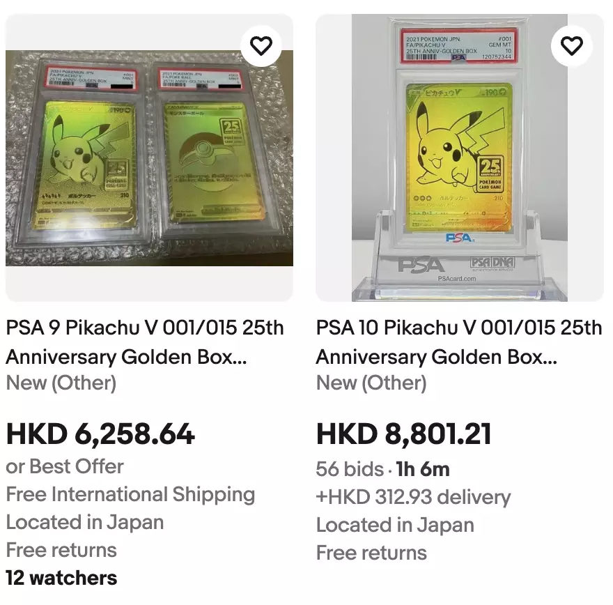 在eBay,PSA10分的「金比卡丘」會比PSA9分的貴上2200多港幣。eBay截圖