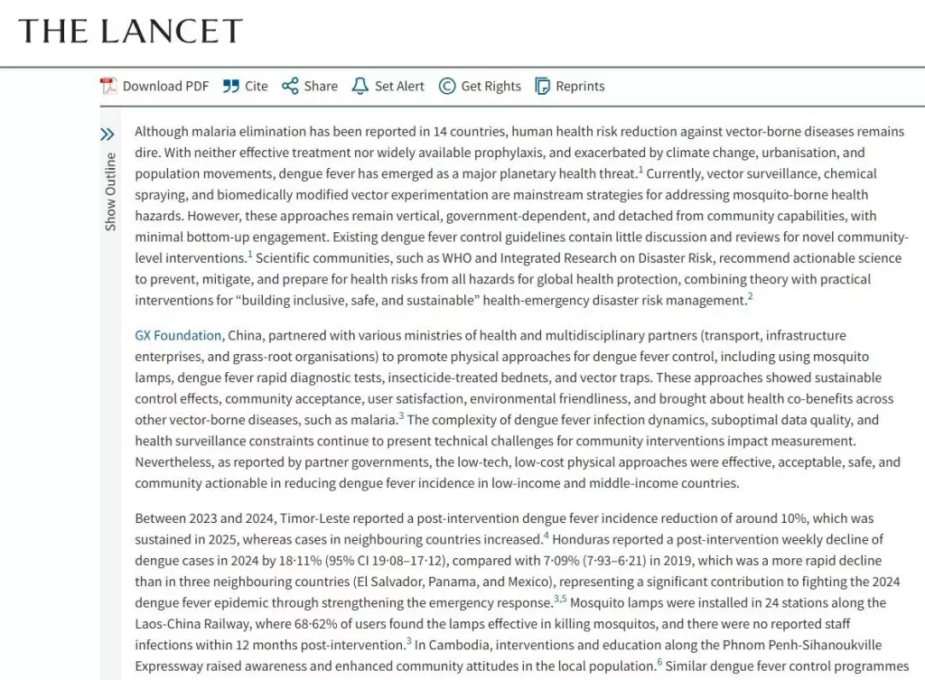 該文章由基金會主席梁振英、總幹事陳英凝、非洲及青年總監杜沛欣、高級項目經理(環球數據管理主管)黃喆,以及高級項目專員容樂怡共同撰寫。文章指出,2024年全球登革熱病例突破1440萬,創下歷史紀錄。目前醫學上尚無針對性的抗病毒藥物,傳統化學噴灑方式則面臨環境保護與蚊蟲抗藥性的挑戰,而生物防治方法不僅成本高昂,也存在生態影響的爭議。在這樣的背景下,基金會創新地提出以「物理防治為核心」的綜合防控策略,推廣「防蚊五寶」——包括滅蚊燈、快速檢測包、蚊帳、蒼蠅紙與宣傳教育材料。這套「低技術、低成本、社區主導」的防蚊模式,已在基金會的合作國家中證實其成效、安全性與高度的社區接受度。