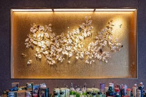 顧客踏入店內的那一刻,便會感受到一種寧靜幽雅的建築氛圍,靈感源自中國傳統,卻又融入了現代美學。店舖大門牌匾由本地書法家黃宣游創作,將中華文化與當代設計巧妙結合。穿過大門,店舖一側展出由礦物顏料繪畫創作藝術家魏舍椏創作的礦物顏料畫作,以天然礦物與泥土顏料細緻描繪咖啡樹生命週期的自然之美。店內亦設置陶瓷藝術家王俊賢的瓷雕藝術裝置,以雲南山水與中國哲思美學為靈感,透過質感與律動重新演繹咖啡植物之美。星巴克與三位本地藝術家攜手展現他們對藝術的熱誠,共同為全新概念店增添獨有的藝術氛圍,邀請顧客放慢腳步,在享用星巴克咖啡同時在細節中感受傳統與現代美學交融之美。