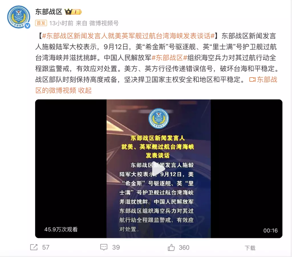 解放軍東部戰區新聞發言人李熹表示,解放軍東部戰區14日圓滿完成「聯合利劍-2024B」演習各項科目,全面檢驗了戰區部隊一體化聯合作戰能力。戰區部隊時刻保持高度戒備,持續加強練兵備戰,堅決挫敗「台獨」分裂行徑。