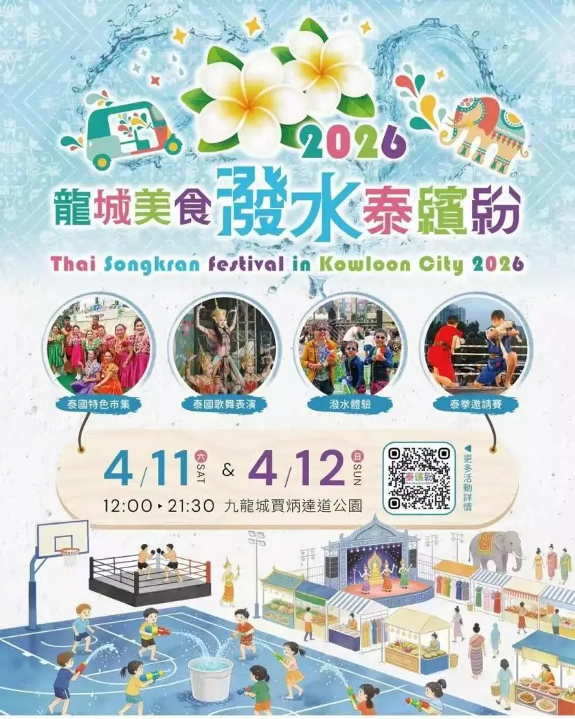 一連兩日(4月11日至12日)於九龍城賈炳達道公園足球場舉行的「龍城美食潑水泰繽紛2026」星期六正式開幕。活動集泰國特色市集、潑水體驗、泰拳表演賽及文化演出於一身,並新增「消費優惠雙重賞」,吸引大批市民及遊客到場感受濃厚泰國節慶氣氛。