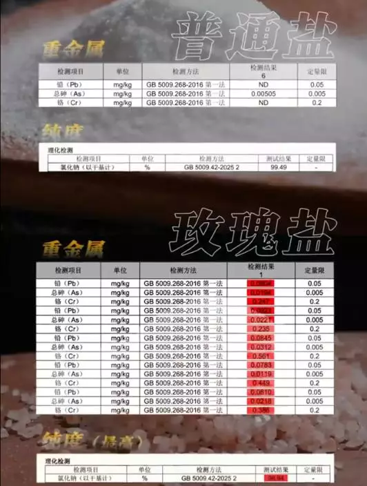 該測評機構的技術人員懷英對記者表示:「首先,我們檢測了氯化鈉的含量,也就是食鹽的主要成分,發現這些樣品未達到國家食鹽的強制標準。其次,我們檢測了重金屬的含量,與普通食鹽進行對比後發現,這些『玫瑰鹽』中的重金屬含量遠超過普通食鹽,存在一定風險。第三,我們對『玫瑰鹽』和普通食鹽進行了溶解實驗,發現『玫瑰鹽』中含有大量不溶物,而普通食鹽則呈現清澈透亮。雖然我們並未發現超標情況,但我們發現這些樣品中鉛、鉻、砷等重金屬的含量遠超過普通食鹽。」
