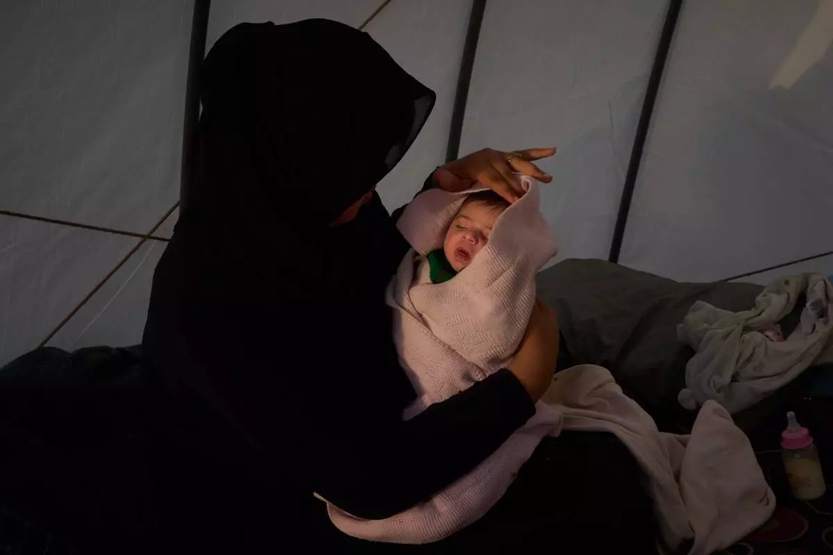 海法肯喬(Haifa Kenjo)抱著她15日大的女兒希曼,她們因以色列空襲貝魯特南部郊區而逃離家園。攝於2026年4月12日周日,肯喬在貝魯特用作庇護所的帳篷內誕下希曼。(美聯社圖片/Emilio Morenatti) AP圖片